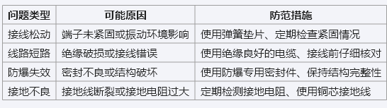 接線所用電纜應(yīng)為阻燃或耐火型,且具有良好的絕緣性能;接頭應(yīng)選用防爆型專用接頭,并確保連接牢固、密封良好。